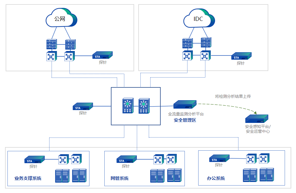 • 在私网重要网元节点部署探针,可实现对核心系统进行网络安全重点监测。