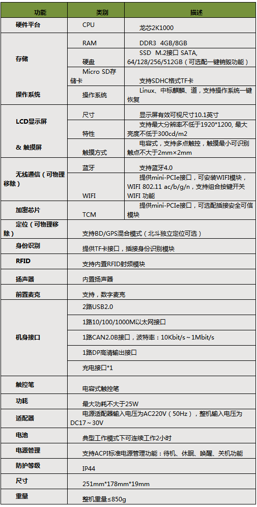 具有优异的环境适应能力,镁合金机壳、强化橡胶包边、均温、耐冲击和振动结构等设计和工艺处理满足各种环境适应性对温度、振动、冲击、跌落、静电、电磁兼容性等要求,可广泛应用于各种恶劣环境。其计算性能和环境适应能力代表了目前国内同类产品先进水平。可用作户外空气终端、车载通信终端、轨道交通、地面站、环境监测终、地质地貌测绘终端、安保终端。