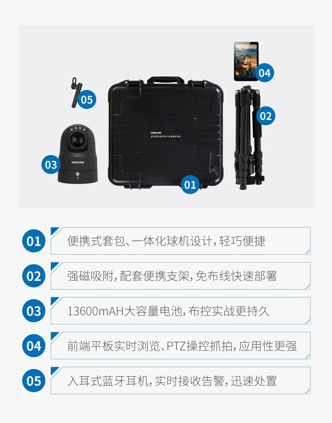 设计上,科达5G智能布控球由一个完整的产品包组成:手提式安保箱内含一体化球机、专用便携式三脚架、PAD平板、蓝牙耳机等,拎包即走;一体化球机采用吸顶云台架构,底部强磁吸附,可随时随地部署,即装即用。