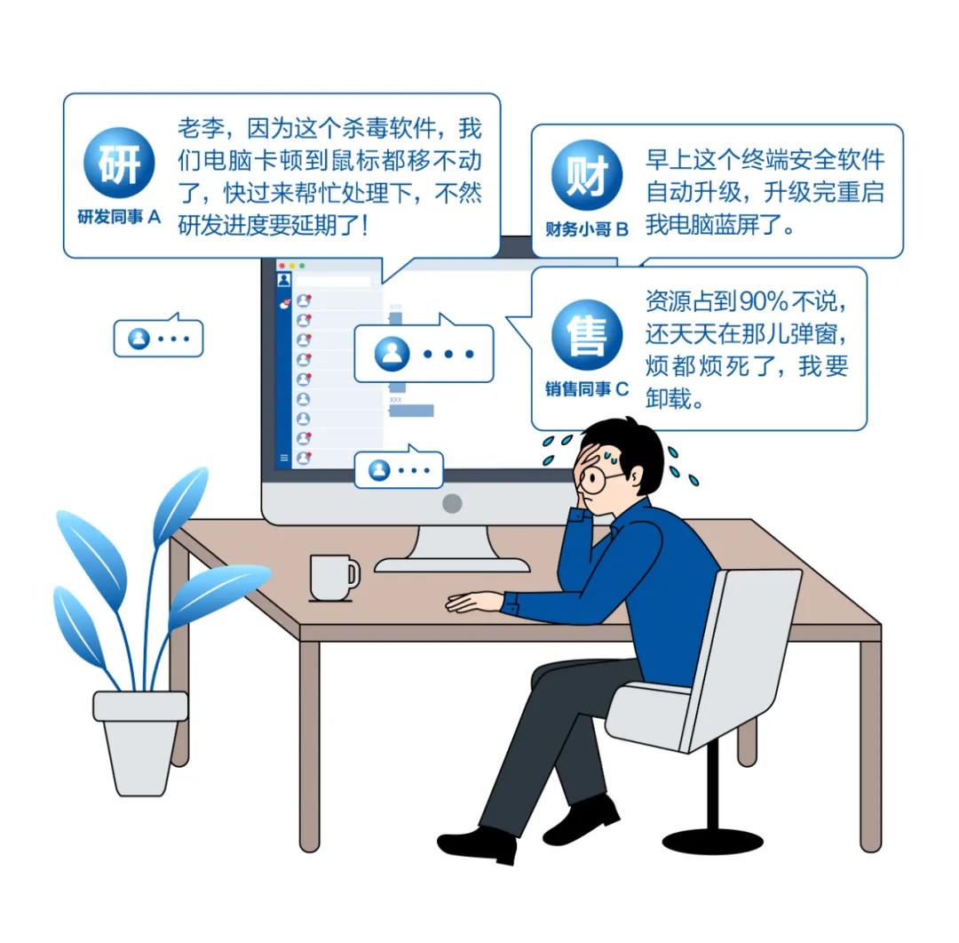 然而传统终端安全软件的部署却给运维管理员带来了极大的挑战,终端卡顿、蓝屏,业务中断问题接踵而至,资产混乱无法梳理、安全运维工作繁重如影随形,如何兼顾体验及安全性成为了组织单位终端安全建设的难题。