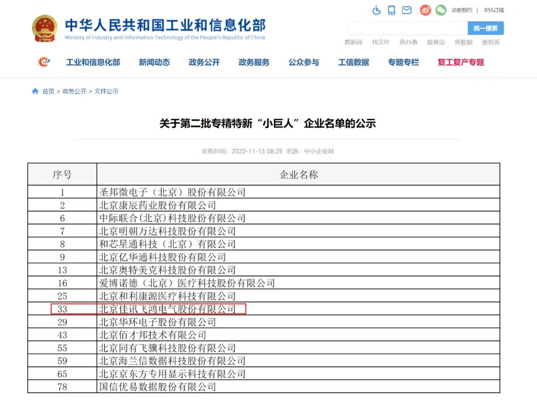佳讯飞鸿入选国家第二批专精特新“小巨人”企业名单
