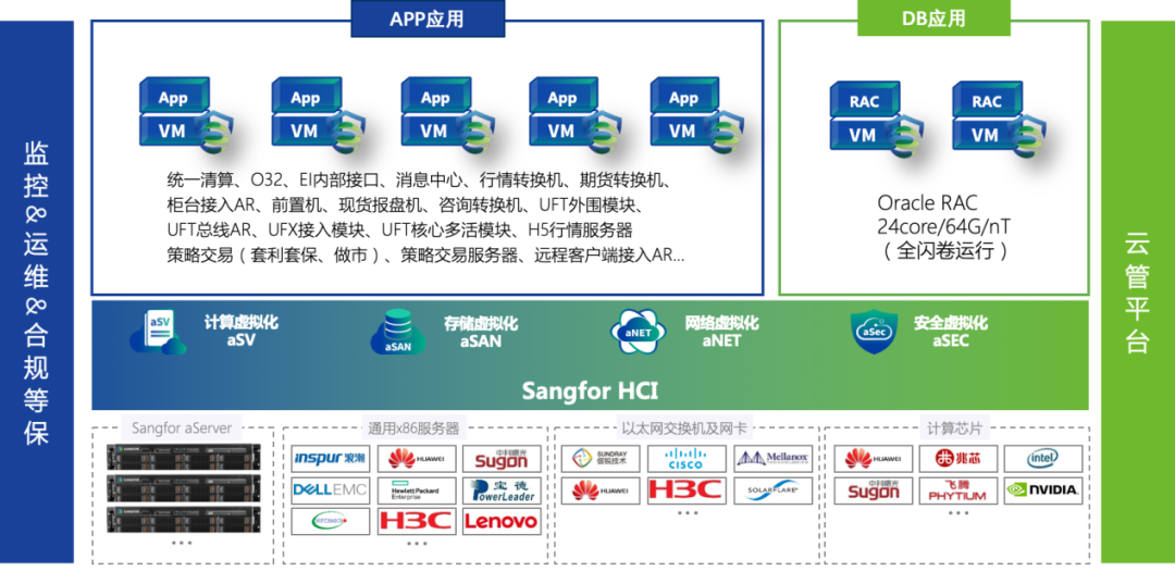 1. 底层硬件:该平台底层硬件是由深信服超融合一体机和通用服务器组成的标准化资源池模块。其中,软件不绑定硬件,恒生O32可根据自己的需求选择硬件设备,信服云的架构路线上同时兼容X86和ARM两个技术栈。