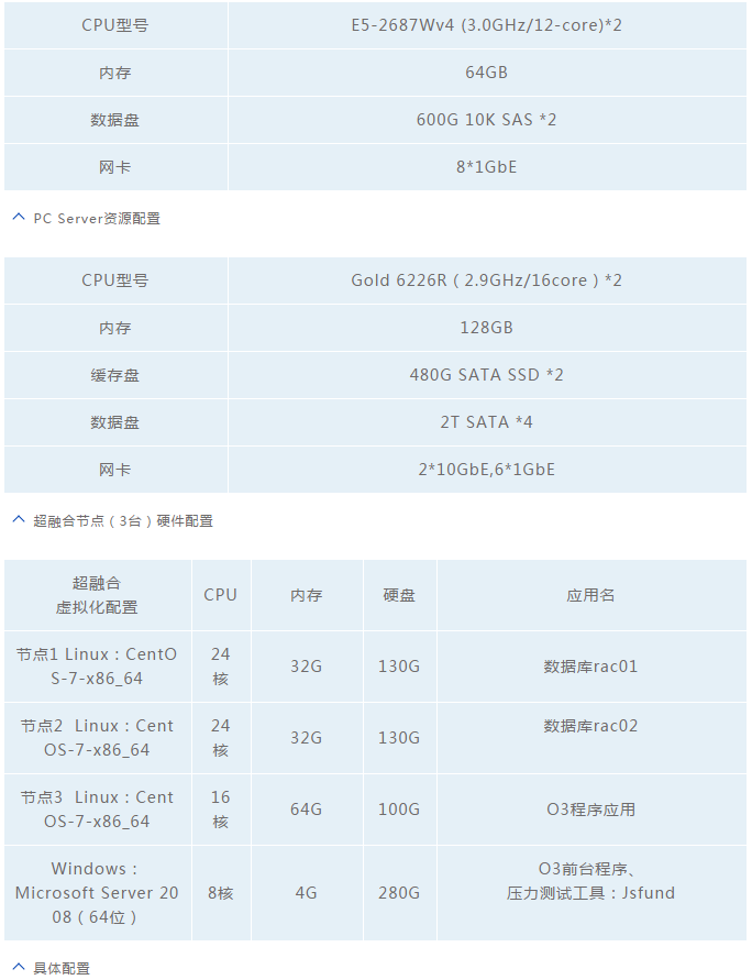 超融合架构使用了3台深信服超融合虚拟机组建虚拟化资源集群,以10G交换机作为虚拟分布式存储网连接设备。硬件之上部署超融合软件,虚拟出本次测试所需要的虚拟机承载O32不同组件。