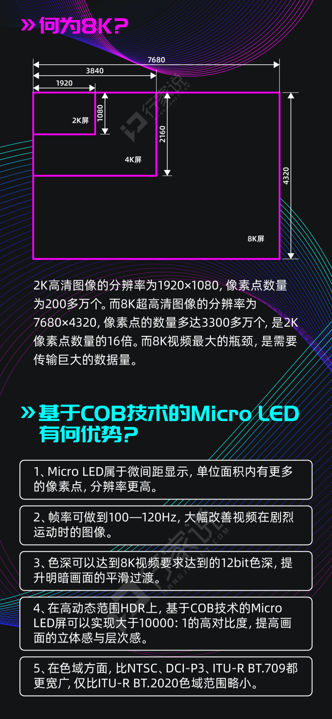但是8K视频最大的问题在于需要传输巨大的数据量。而5G网络的成熟,可以满足8K视频高带宽的要求。而通过5G传输,Micro LED高清显示屏呈现8K画质。