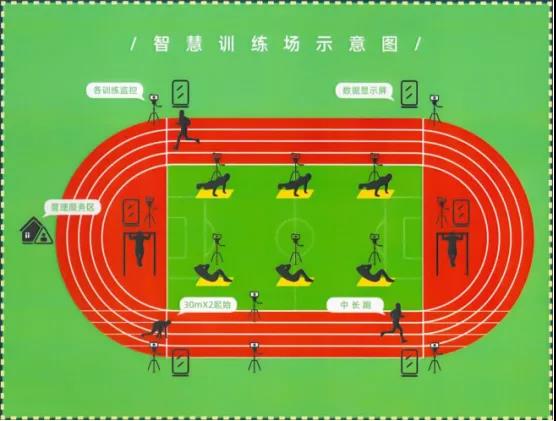 智慧训练场划分为管理服务区、体型测试区、中长跑训练区、30米X2蛇形跑训练区、仰卧起坐训练区、俯卧撑训练区、引体向上训练区、曲臂悬垂训练区、训练数据显示区。若条件允许,还可拓展设置双杠训练区、400米障碍跑训练区、攀爬训练区等。
