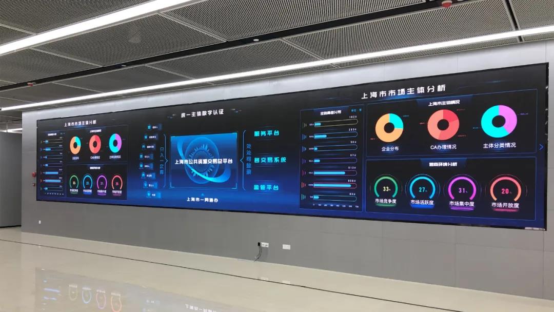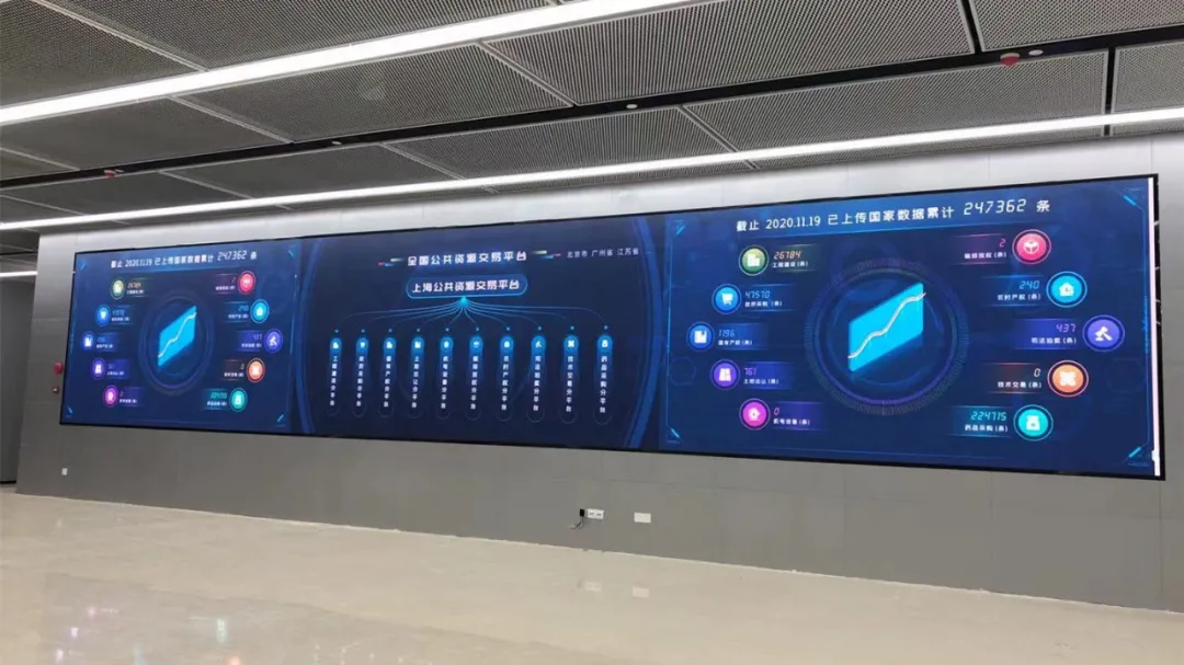 雷曼光电COB超高清显示屏全貌展示上海市公共资源交易数据,与各数据采集节点及处理器联动,实现统计汇总、指标分析和趋势预测等数据可视化,用于监测预警预测、信用奖惩和辅助决策等综合监管。