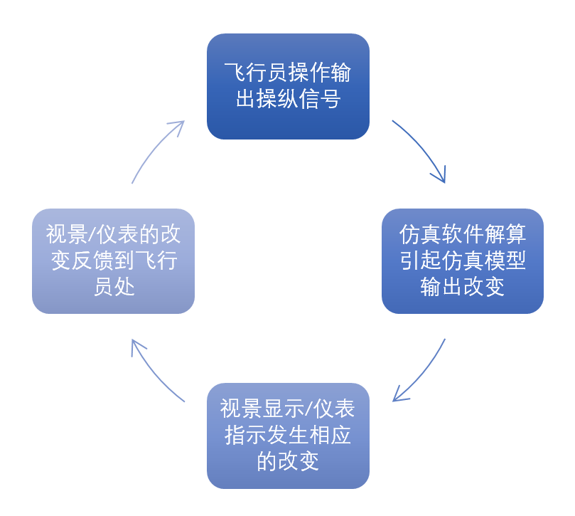 某型飞机特种设备虚拟仿真训练系统实验台应用人在回路的半实物仿真设备,结合视景软件、飞行仿真软件、仪表仿真软件等共同作用,为飞行学员营造出贴近真实的某型飞机的飞行环境。某型飞机特种设备虚拟仿真训练系统实验台工作原理可以由下图表述: