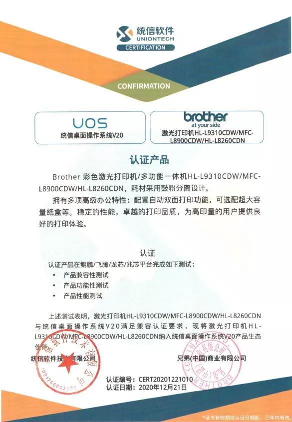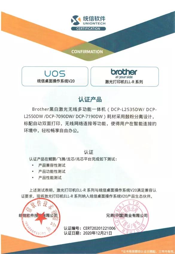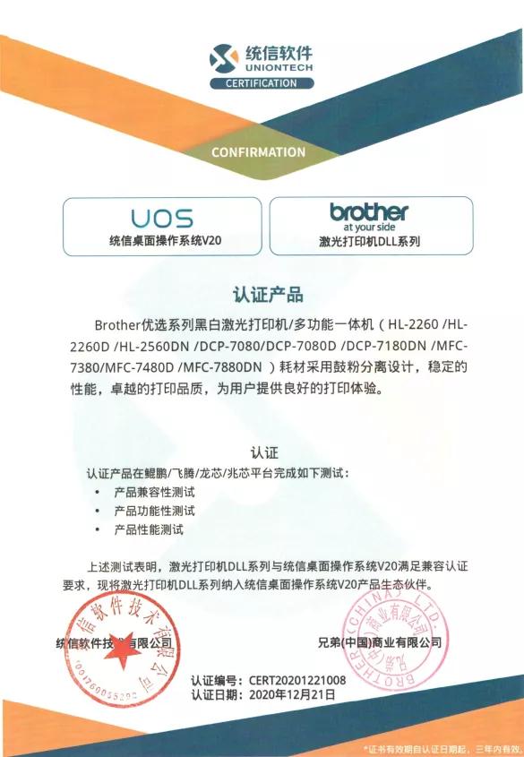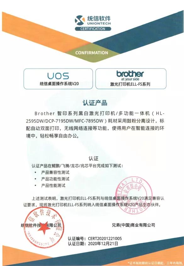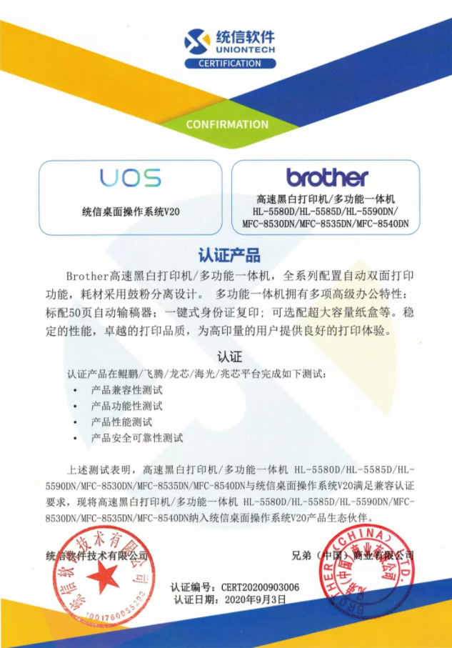 Brother也积极地加入到了这一发展浪潮中,已有多个系列产品*,通过鲲鹏/飞腾/龙芯/兆芯平台的统信桌面操作系统V20的产品兼容性、功能性及性能测试,全部满足于统信桌面操作系统V20的兼容认证要求,并被纳入统信桌面操作系统V20产品生态伙伴体系。