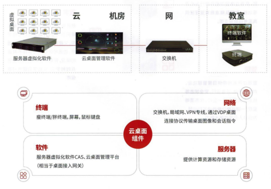 某司通过桌面云替代传统的PC,彻底改变了传统终端的建设、使用和管理模式。通过桌面云架构,学习室只需要安装瘦终端、显示器以及鼠标键盘等外设,即可完成部署;桌面云服务器部署在数据中心机房中,通过网络将桌面画面推送到连接瘦终端的显示器上。所有的资源和用户都通过控制平台进行统一的监控和管理。