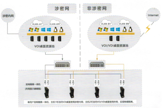 机关固定场所采用VDI桌面:适用于网络条件好的固定在线场景;性能优化、数据安全;双网隔离、简易运维。
