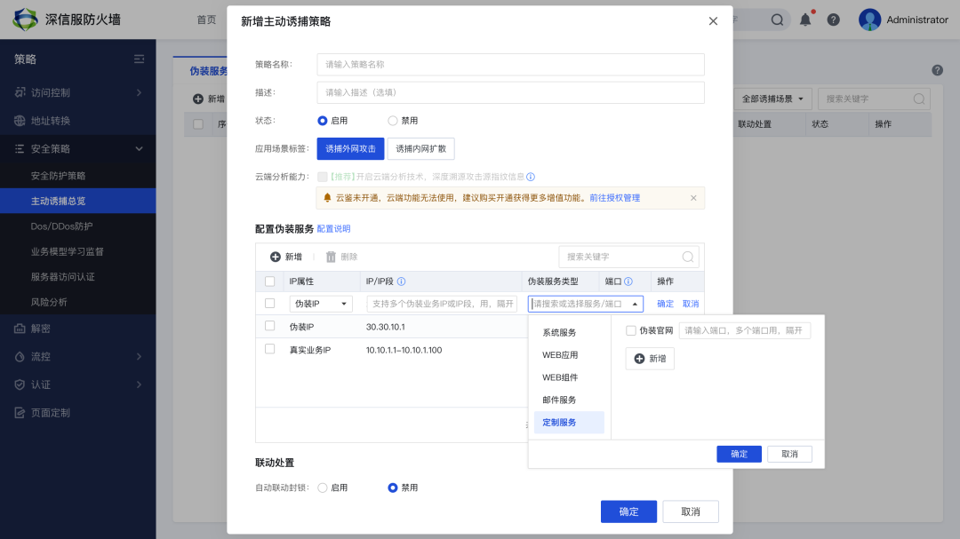 针对传统的被动型安全防御面临的攻击行为感知不及时、分析过程繁琐、处置效率低等问题,深信服下一代防火墙通过部署一些作为诱饵的伪装业务,诱捕攻击行为,再引流至云端蜜罐,通过云端蜜罐的高仿真虚拟环境及多种分析引擎,实现: