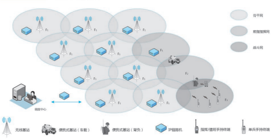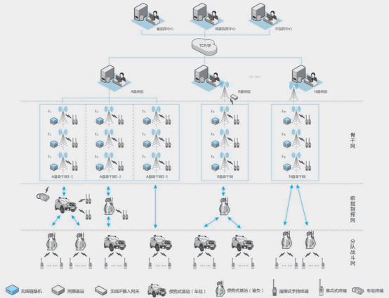 系统采用北峰独创的3+3+3应急通信解决方案,即:3层组网(骨干网、前指指挥网、战斗网)、3级指挥(基指、前指、分队)、3种应用(日常勤务、应急作业、跨区支援)。骨干网以固定架设中继基站为主、车载移动中继基站为辅,充分考虑应急部门的建制特点,在满足平战结合要求的同时,突出保障应急处突行动中的指挥通信需求;前指指挥网以独立成网为形式,以各级前指为最小单元,依托前指指挥车车载式移动基站为主,便携式基站为辅,充分考虑前指在应急行动中的“全过程、全要素”通信需求,重点满足前指的运动通信和靠前指挥需求;战斗网以组成独立的局域网为形式,以分队为最小单元,依托便携基站提供中继通信,解决分队对上通信问题为主、分队内部单兵战术通信问题为辅,重点满足整个通信网覆盖到最后一公里的需求。