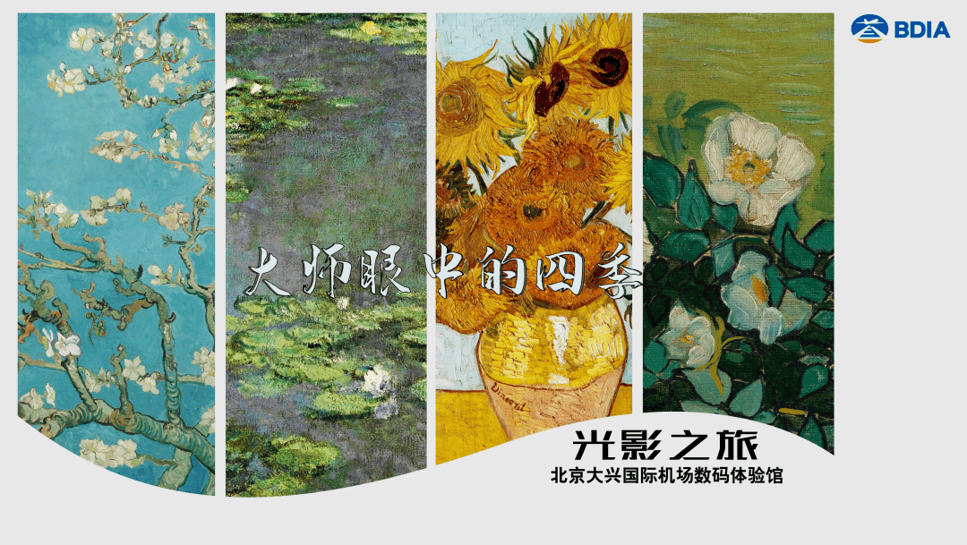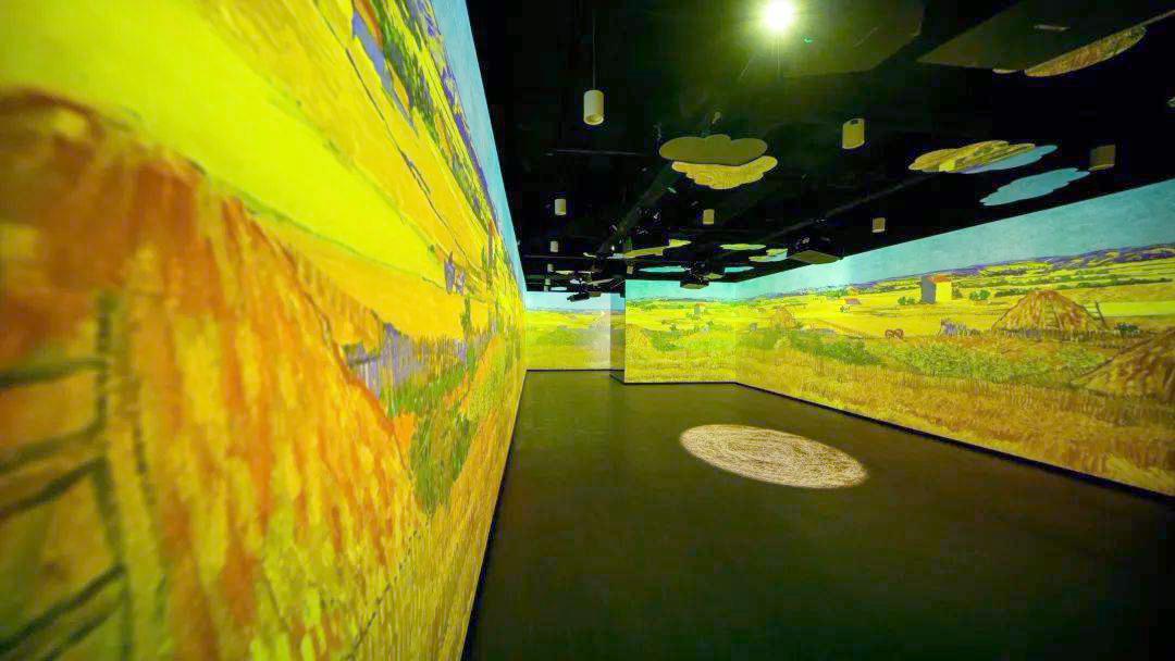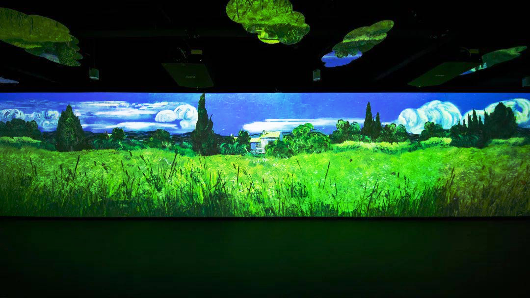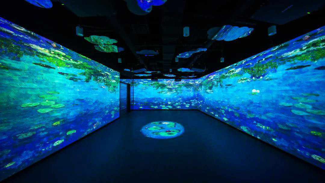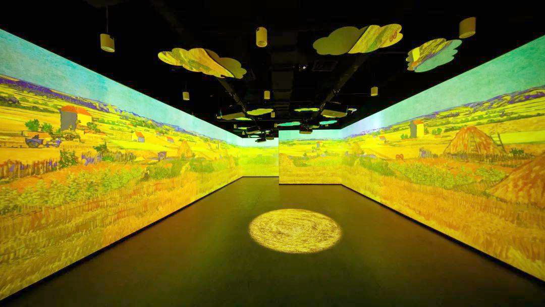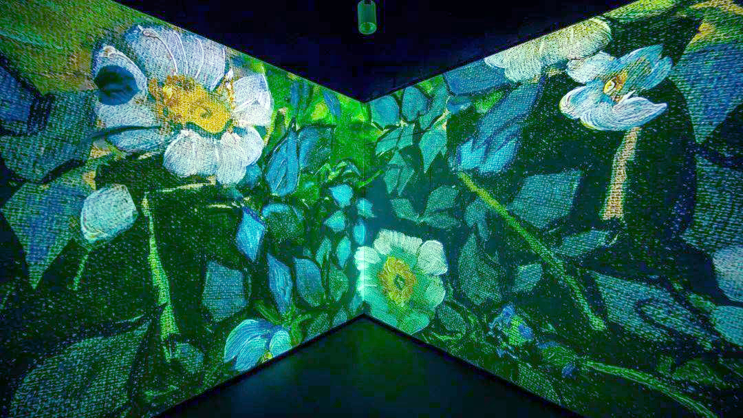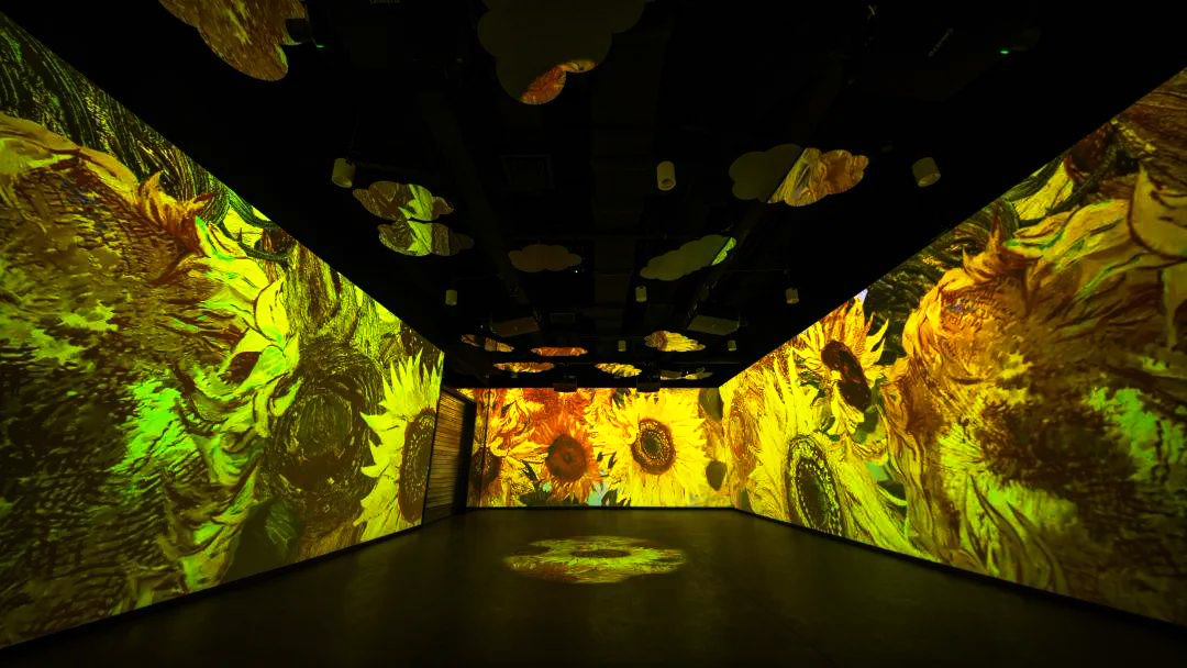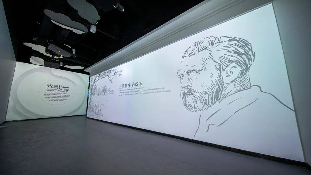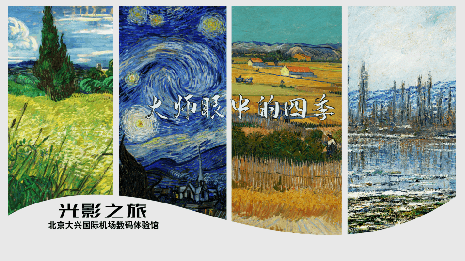 “光影之旅”展厅以“大师眼中的四季”为主题,选用梵高的《杏花》、《绿柏麦田》、《星月夜》、《向日葵》、《丰收》、《野玫瑰》,莫奈的《睡莲》、《融化的浮冰》,共八幅画作,展现生长、盛开、成熟、凋零。游客可以置身画作之中,切身感受四季更替,万物更新带来的感动,体会艺术巨擘画笔下的大自然。