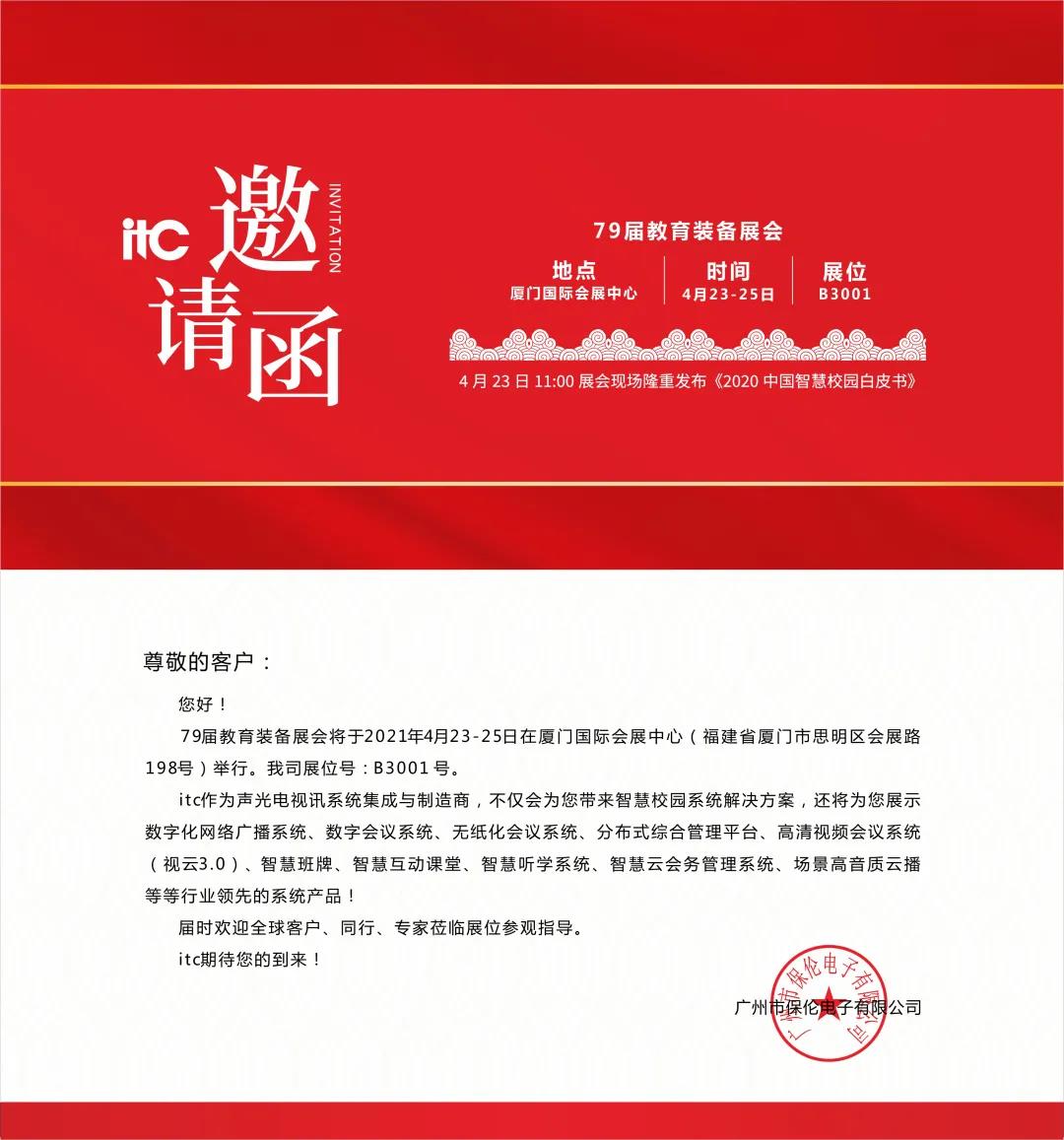 itc正在筹备的厦门教育技术装备展览会即将盛大开幕,将要展出云广播、云视讯、高清录播、校园空间展示平台、IOT教研工具包等产品及解决方案,为广大客户提供智慧教育整体解决方案,助力教育信息化建设,4月23日—25日,厦门国际会展中心B3001号,不见不散。