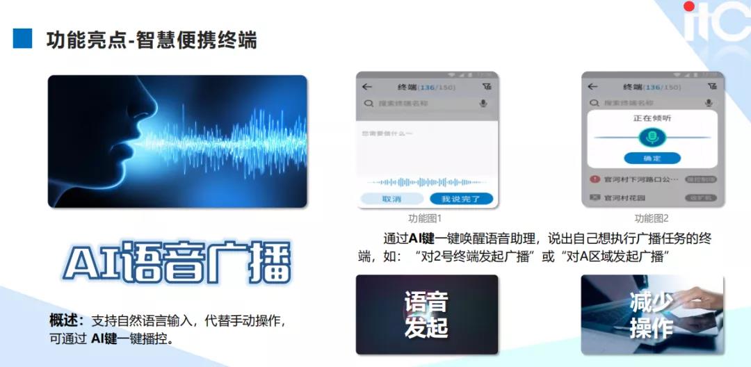 itc智慧便携终端是依托于现代智能化产品轻薄化、便携化的发展趋势,对传统的手持对讲终端进行自主研发创新。与过去的传统式对讲终端相比,便携式专业化广播终端更为灵活、方便、快捷、专业化,可适用于学校、景区、乡镇、交通等公共场所。