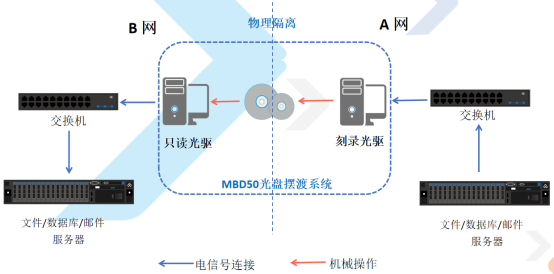 MBD50摆渡机采用光盘作为数据物理传递媒介,分内网、外网两个模块进行中间无连接的单向信息传递、对摆渡数据过程可控、摆渡数据审审核、摆渡数据移动存储介质可处理。