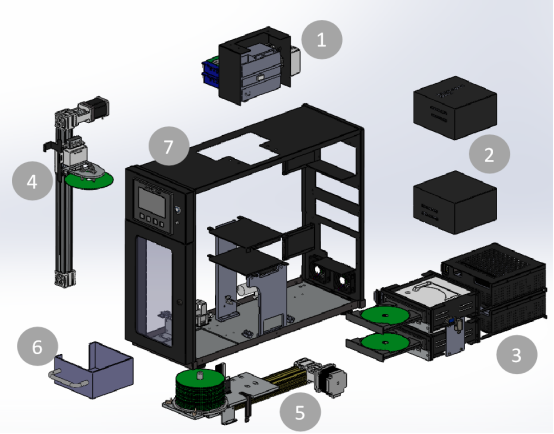 5、水平机械手:用于光盘上料桶的水平位移,配合垂直机械手进行取放光盘操作;
