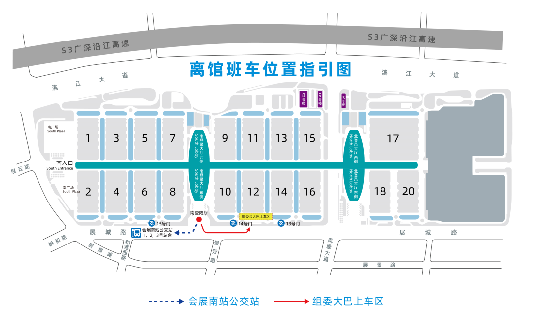 S3沿江高速 → 国际会展中心收费口 → 凤塘大道 → 展景路 → 滨江大道
