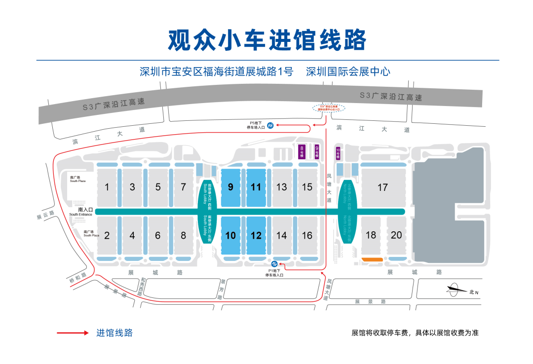 自驾前往请导航深圳国际会展中心P1、P5地下停车场,停放至F停车区,过安检乘电梯至展馆。