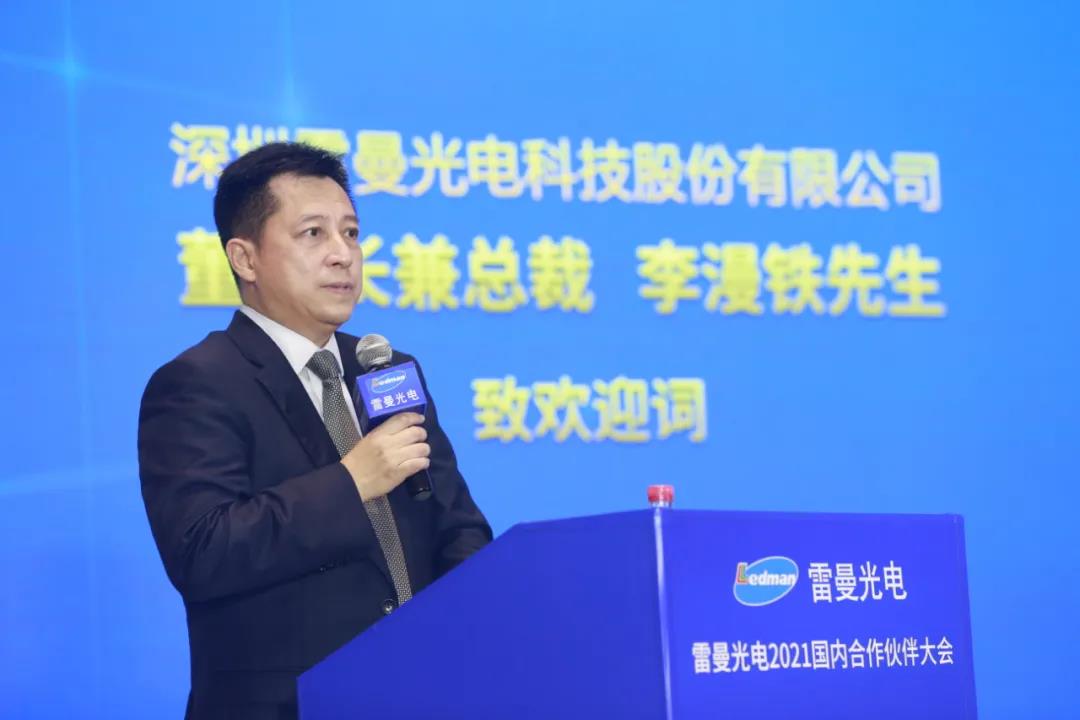 雷曼光电李漫铁董事长致欢迎词,他对远道而来的各位嘉宾表示欢迎,对与各位合作伙伴、供应商朋友更深层次的交流与合作表示期待。