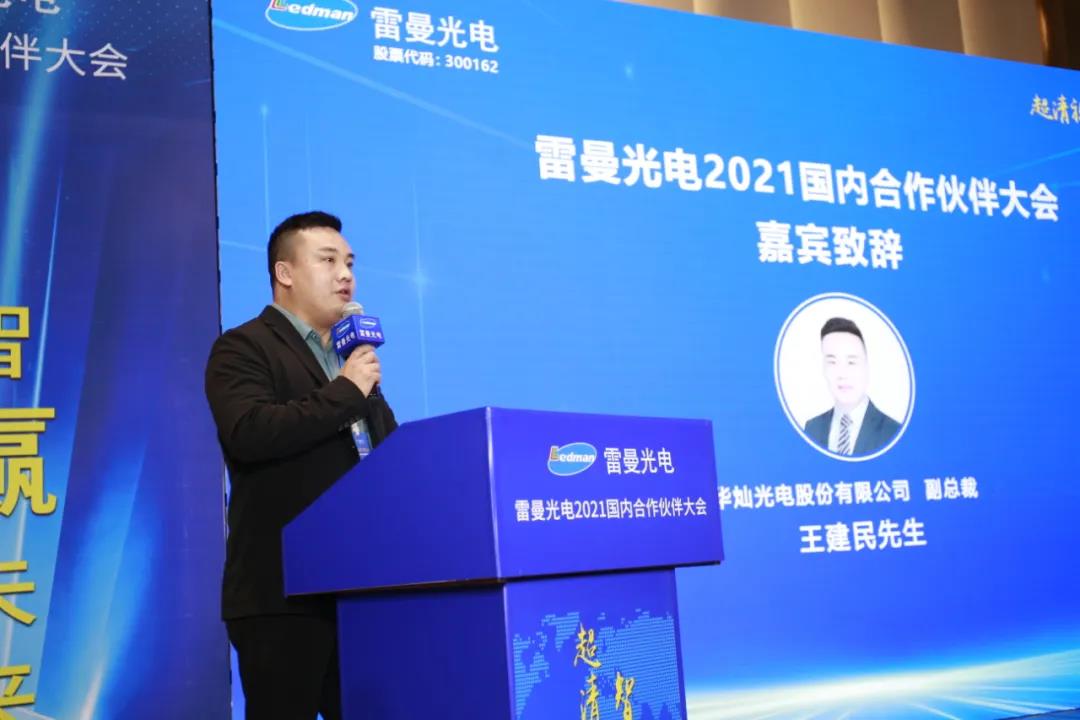 华灿光电股份有限公司王健民副总裁作为雷曼的合作伙伴之一发言,他表示,华灿作为雷曼光电的战略合作伙伴,已经与雷曼携手走过了14年,华灿对雷曼5G+8K超高清显示的未来充满信心,华灿将一如既往优先保障雷曼的芯片供应,与雷曼共建共赢。