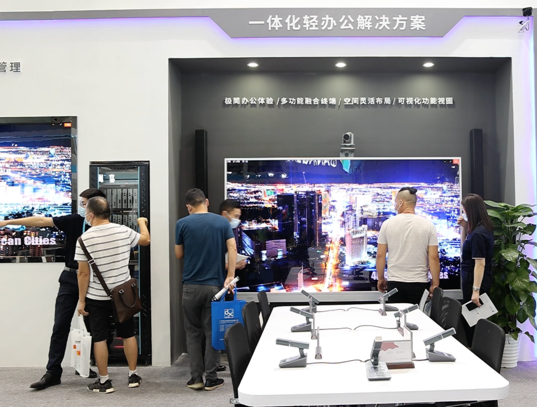 展台现场真实还原了会议场景,提供一体化轻松办公解决方案,更有专业工程师站台,详解会议专业化部署方案,演示会议智能化管理,现场体验高清会议,畅享高效办公。