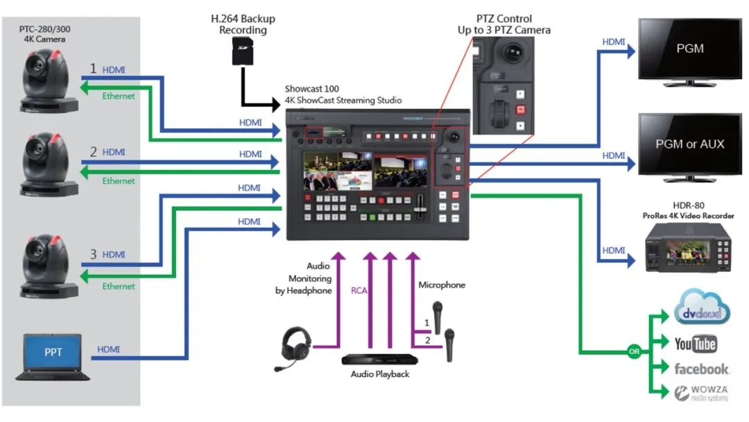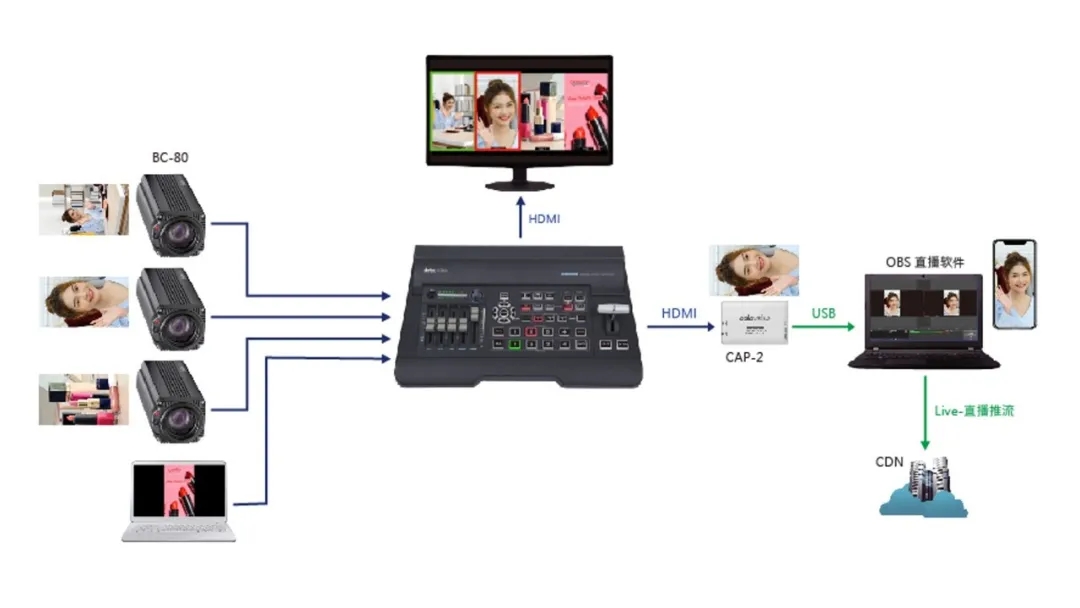 完整的高性价比HDMI节目制作解决方案,不仅能适用于棚内、室外的现场节目拍摄,同时适用于现在火热的网络直播,也是大家热衷选择HDMI的切换台及系统解决方案的原因。
