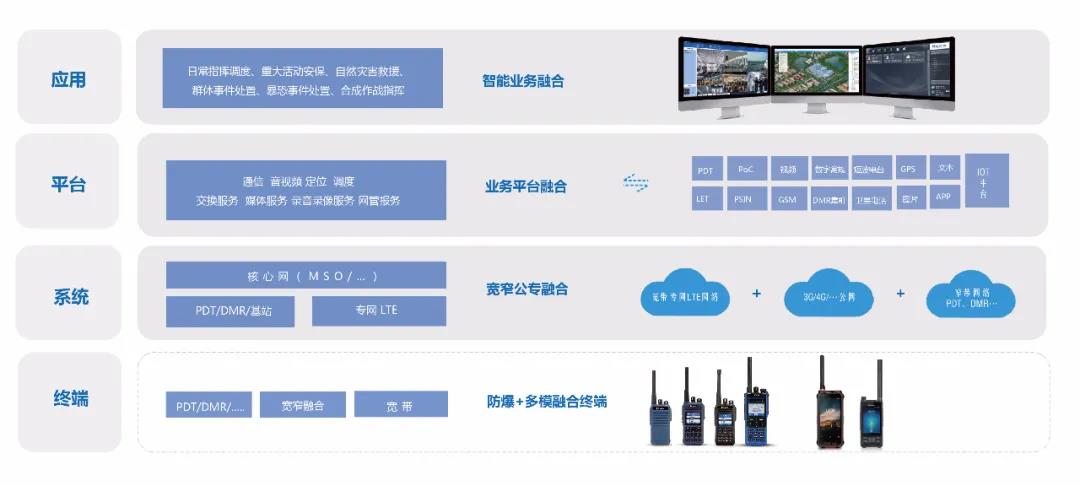 2. 多方案集群覆盖:可根据用户需求采用IP同频同播集群、数字DMR/PDT小集群、数字DMR/PDT大集群等多种集群方案,用于保障基础无线语音数据管理,并专门设立应急通信系统,专网专用;