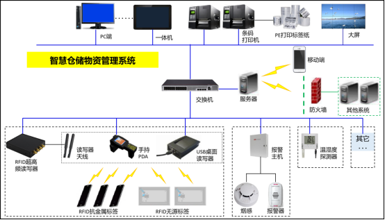 智慧仓储物资管理系统通过采集RFID读写器、手持PDA、报警主机、温湿度探测器、烟雾探测器、报警器等管理仓储库房运行的数据,在系统服务器进行存储、计算、转发、应用和交互,系统在多端展示。同时系统预留接口与其他系统如智慧军营管理系统、财务系统、车辆人员管理系统等进行数据通信交互。