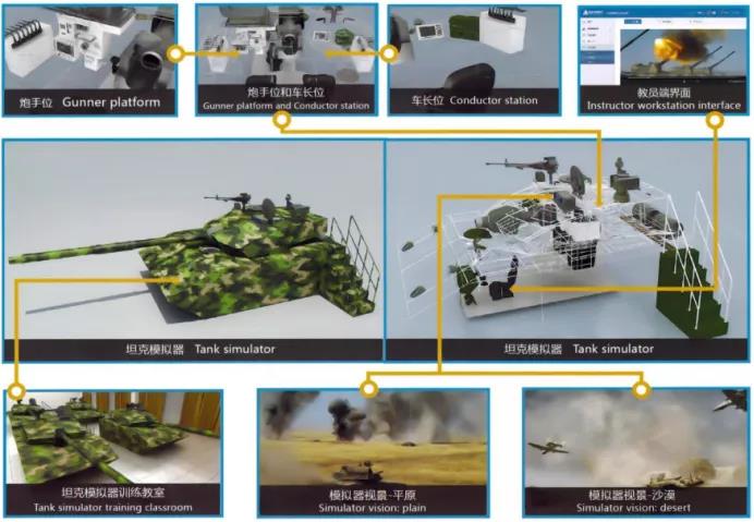 坦克协同训练模拟仿真系统由驾驶操作设备、模拟射击设备、模拟通信设备、驱动采集系统与信息处理控制单元、视景系统、仿真训练软件和教练员工作站等组成。