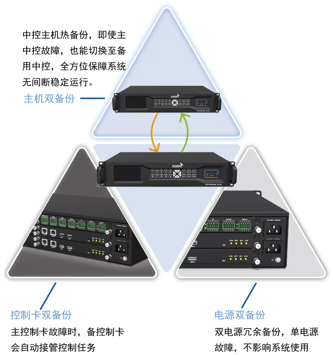 作为各类子系统控制的核心,朱雀中控具备综合冗余备份机制,包括双控制卡热备、双机热备、双电源冗余备份等,为设备安全与稳定性提供充足的后备保障。