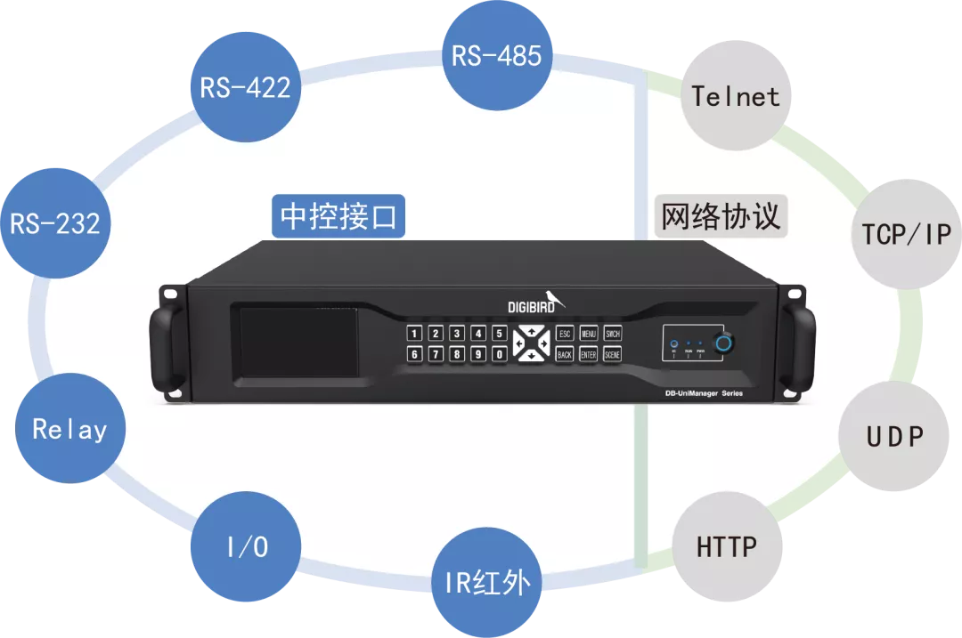 朱雀中控主机在接口方面支持 RS-232,RS422,RS485,I/O,IR,Relay 等多种接口, 网络协议方面支持 HTTP,UDP,TCP/IP,Telnet 等多种协议,兼容市面上的主流 常见设备的对接,对接能力强大、便利、高效、可靠。