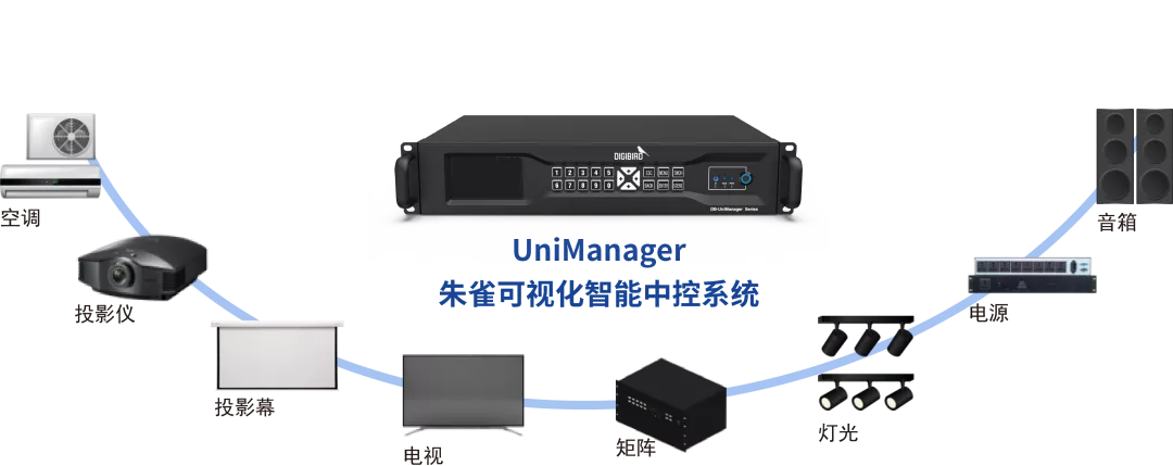 朱雀中控系统设计方案:采用可视化的人机交互理念,从大屏和信号的调度到音频调节、环境控制、环境数据等均能达到实时可视化显示,设备受控状态同步反馈,达到所见即所得的应用体验。