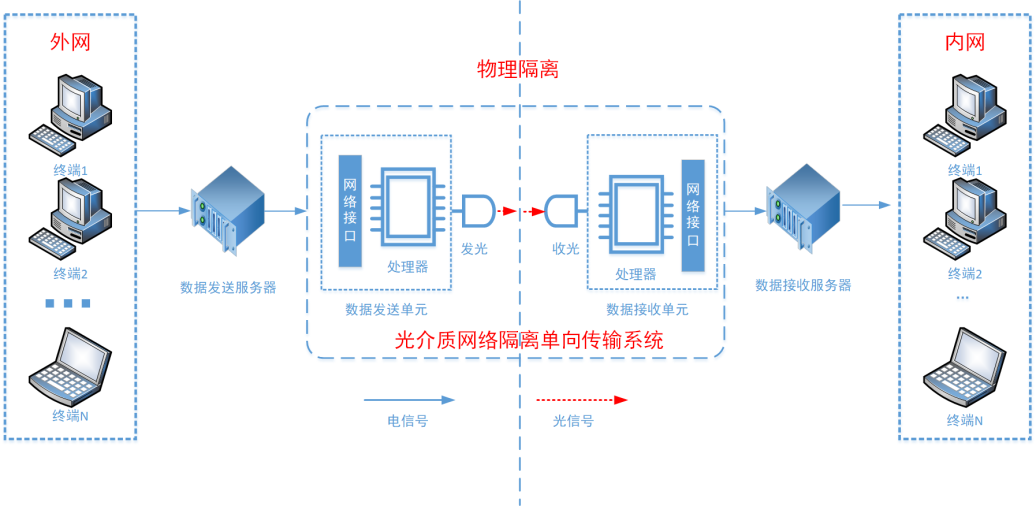 光介质网络隔离单向传输系统将数据发送单元、数据接收单元进行断开,实现两端无物理链接连接,保证内网与外网完全物理隔离。