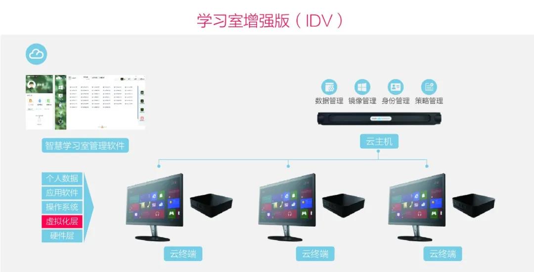 在线学习室终端操作系统及文件存储都在服务器端运行部署,进行集中管理;终端只提供显示及操作功能;