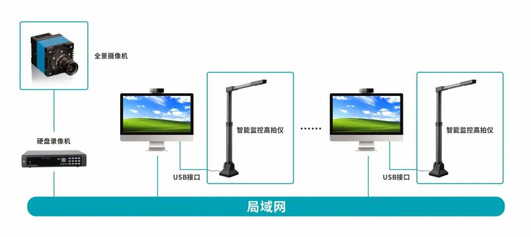 系统主要设备由全景摄像机、正面摄像机、智能高拍仪等组成。全景摄像机对教室全景监控摄像,要求所有考生全部能够监控到,视频无死角。正面摄像机对考生个人的视频图像与声音来进行监管。智能监控高拍仪在课桌上方对考生肢体行为进行检测监管。