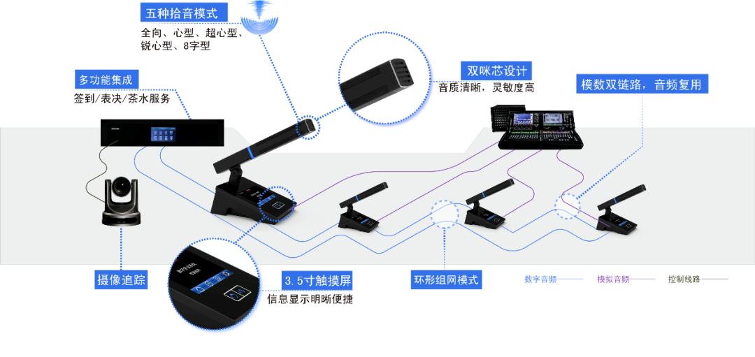 系统环形组网:采用首尾两条线和会讨主机相连,当一个发言单元故障后,变成两条链形链路,只影响故障单点,解决了传统链形组网单点故障后造成故障发言单元及后续所有发言单元掉线的问题。