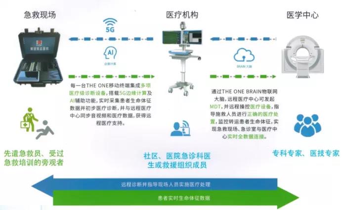 每一台移动终端集成多项医疗级诊断设备,搭载5G边缘计算及AI辅助功能,实时采集患者生命体征数据并初步医疗诊断,并与远程医疗中心同步音视频和医疗数据,获得远程医疗支持。