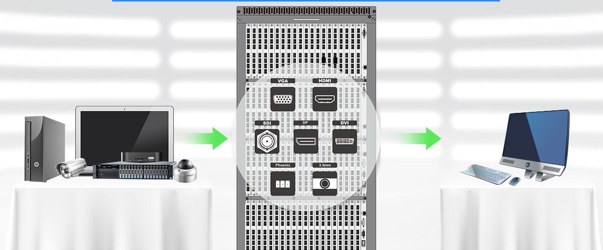 支持服务器、摄像机、DVD、视频会议终端等上百路数据信号接入,