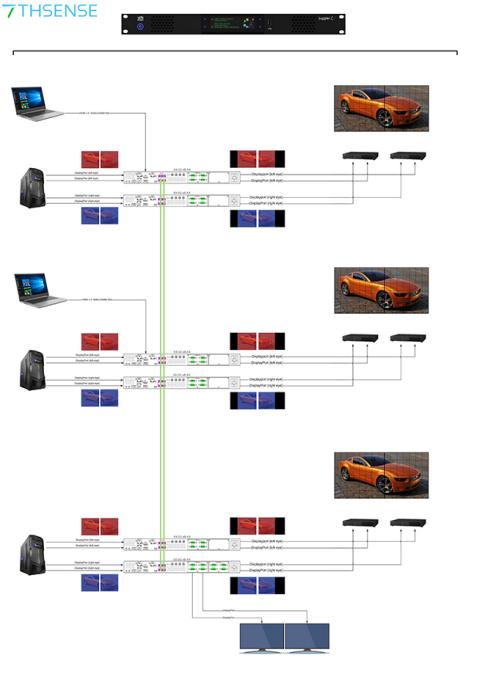 由于目前市场90%的多窗口处理器均无法同时实现所有要求,赢康科技代理的7thSense Juggler像素级图像处理器便脱颖而出,凭借其架构设计的先进性,通过“总线”共享画布的模式,可以支持任意数量设备的堆叠,完美胜任该项目的信号传输处理工作。同时,配合4万流明4K主动立体激光投影机,最终展现出6600×2160分辨率的多达24个立体、非立体多窗口混合显示,充分满足了该单位弧幕显示的复杂使用需求。