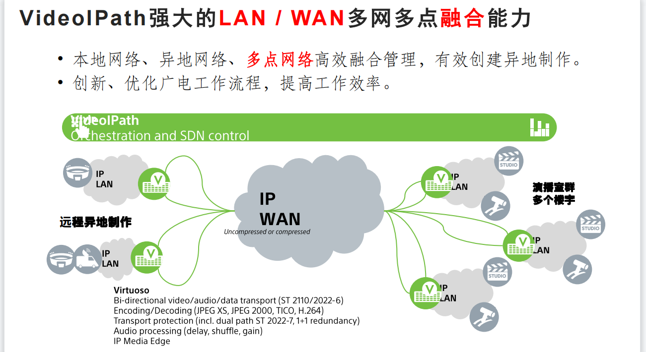 去年9月份,索尼与虚拟化媒体制作解决方案提供商Nevion结成战略合作关系,并全资收购,Nevion成为索尼旗下子公司,全面整合业务。今年索尼和Nevion将进一步深化合作,通过Nevion先进的媒体网络调度与SDN控制系统VideoIPath,并全面整合索尼自有成熟的LSM广电IP Live管理系统,从设备到整个信号调度,一直深入到交换机、网络构架的统一管控,帮助电视台实现端到端、深层次的IP化、虚拟化改革,打造全IP流程。