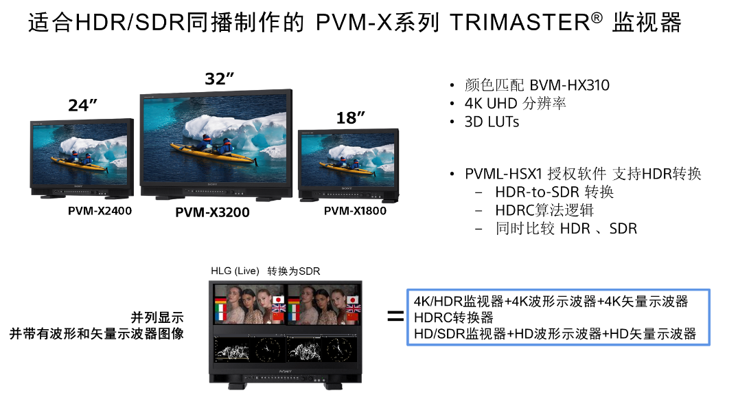 索尼PVM-X系列32寸、24寸、18寸监视器产品特点突出,除了显示的准确度逼近BVM级别之外,更重要它的功能特别强,尤其是有一个HDR转SDR下变换的授权许可,有了授权许后,一台监视器可以同时监看原生的HDR图像和经过PVM-X监视器实时转换后的SDR图像,同时还可以看到HDR、SDR图像的波监和矢量,等于这一台监视器用户可以看4分割画面,挺实用的一个功能。适合超高清时代高质量HDR、SDR同播制作。