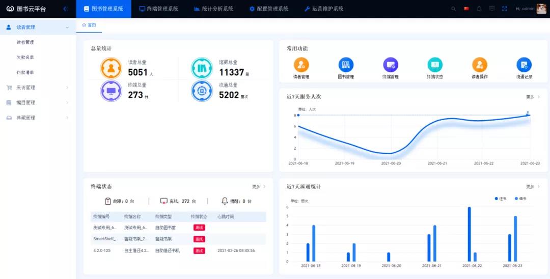 终端地图模块,链接百度地图,精确显示各个终端所在位置,便于馆员的可视化管理;终端状态模块,清晰显示各位置设备的功能状态、在线离线状态等信息,异常情况直观提示,便于馆员管控;运维监控对接图书馆大数据智慧墙,清晰显示图书馆书籍与读者流通数据,馆员可直观了解当日图书馆数据流通信息。