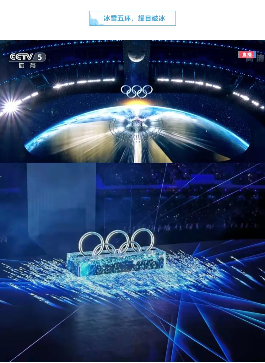 冰五环是本届冬奥会开幕式最重要表演道具之一,用于直接展示冬季奥林匹克精神。晶莹剔透的冰雪五环“破冰”而出,寓意着打破隔阂、互相走近,大家融为一体,由此打开了一个璀璨琉璃的冰雪世界。
