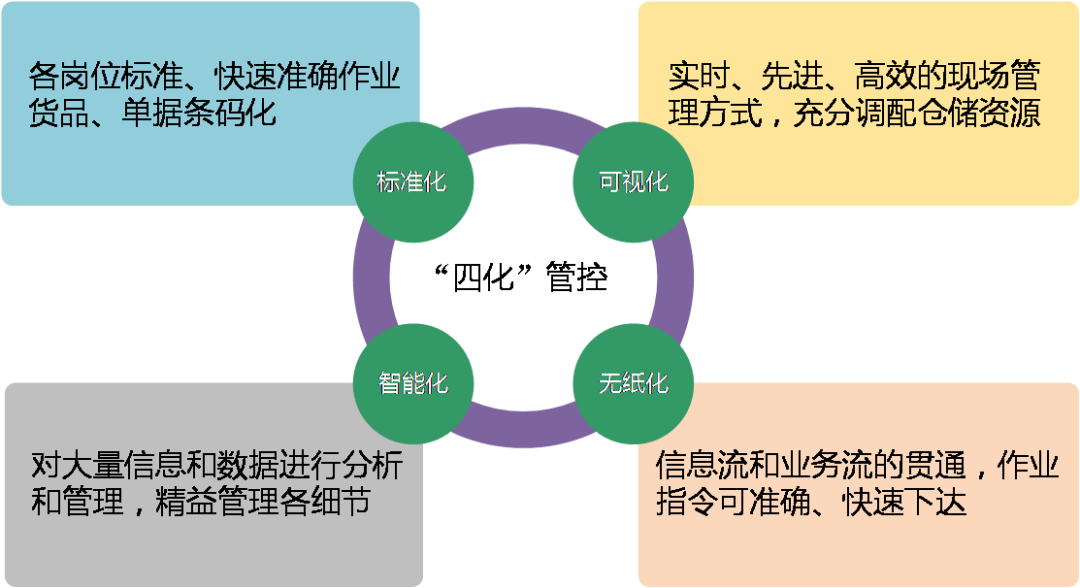通过基于物联感知及数据融合驱动的物资仓储可视化集成管理手段(简称“仓储管理系统”),实现仓储物资”四化“管控: