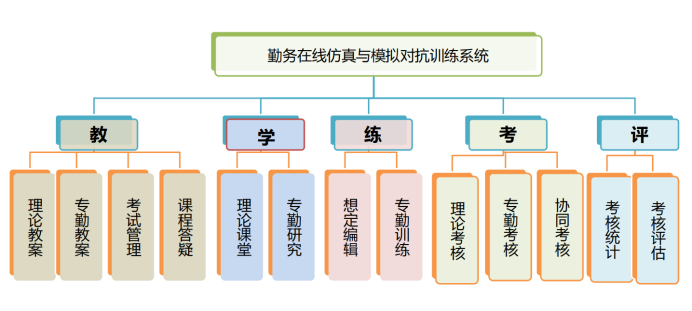 勤务在线训练平台、场景三维建模、导调模块、想定编辑、评估回放、考评汇总等。