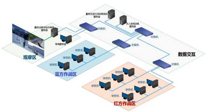 观摩大屏、导调服务器、多人协同服务器、席位主机、网络交换机等。