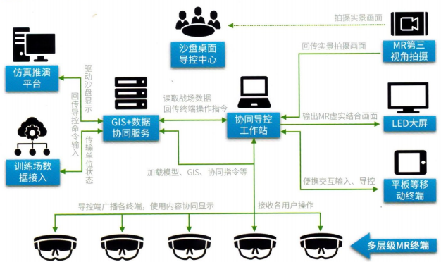 系统集成混合现实态势显示平台(MR眼镜+全息沙盘)、数据服务器、以及MR第三方视角摄录工作站。