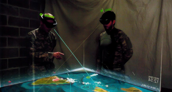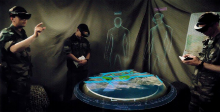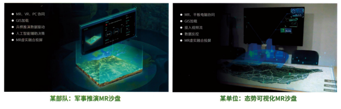 某司利用混合现实技术,基于全息3D地形、作战要素3D模型、立体交互界面等,构建MR军事沙盘导控系统,全面提升战场态势推演及指挥能力。