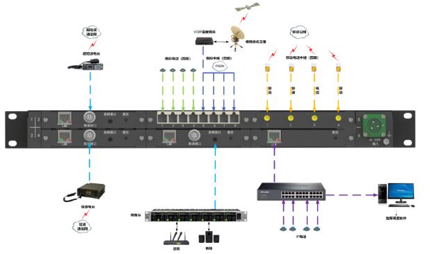 (4) 灵活一体化接入功能:通过FXO、FXS、移动电话、无线电台、4G模块、无线/音频接入模块等灵活组合实现各种制式通信网络互联互通;